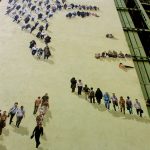 From a distance, the dispersed bodies coalesce into a recognizable portrait; up close, the image dissolves into individual movements and directions. This dual reading creates a dynamic tension between unity and multiplicity.