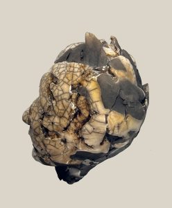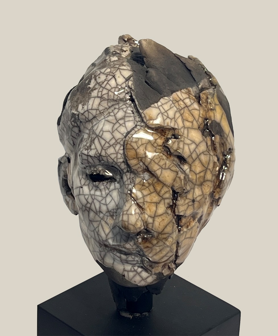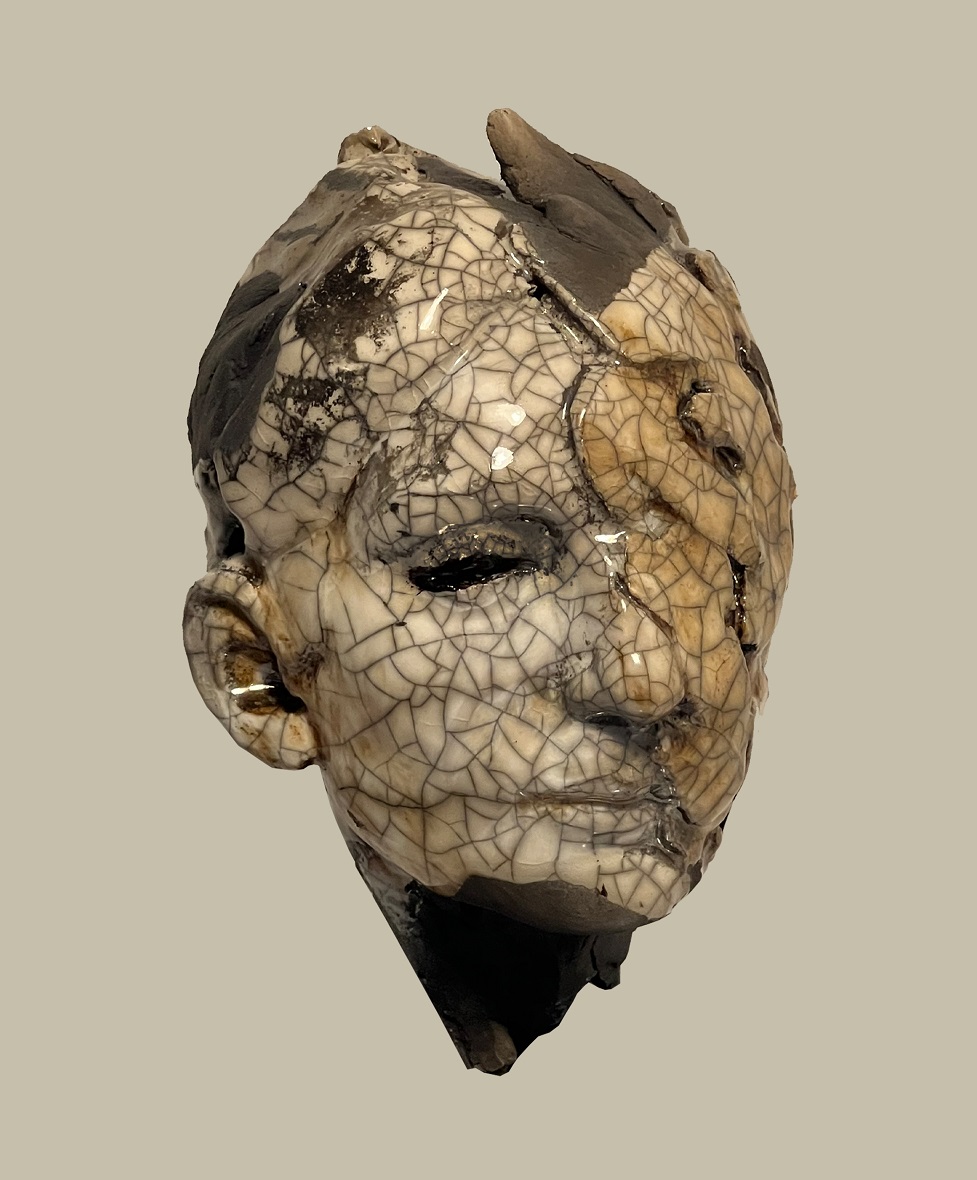 The crackle glaze produces an intricate network of lines that both define and destabilize the form, interrupting the continuity of the features. The surface appears segmented, as if held together through tension rather than cohesion.