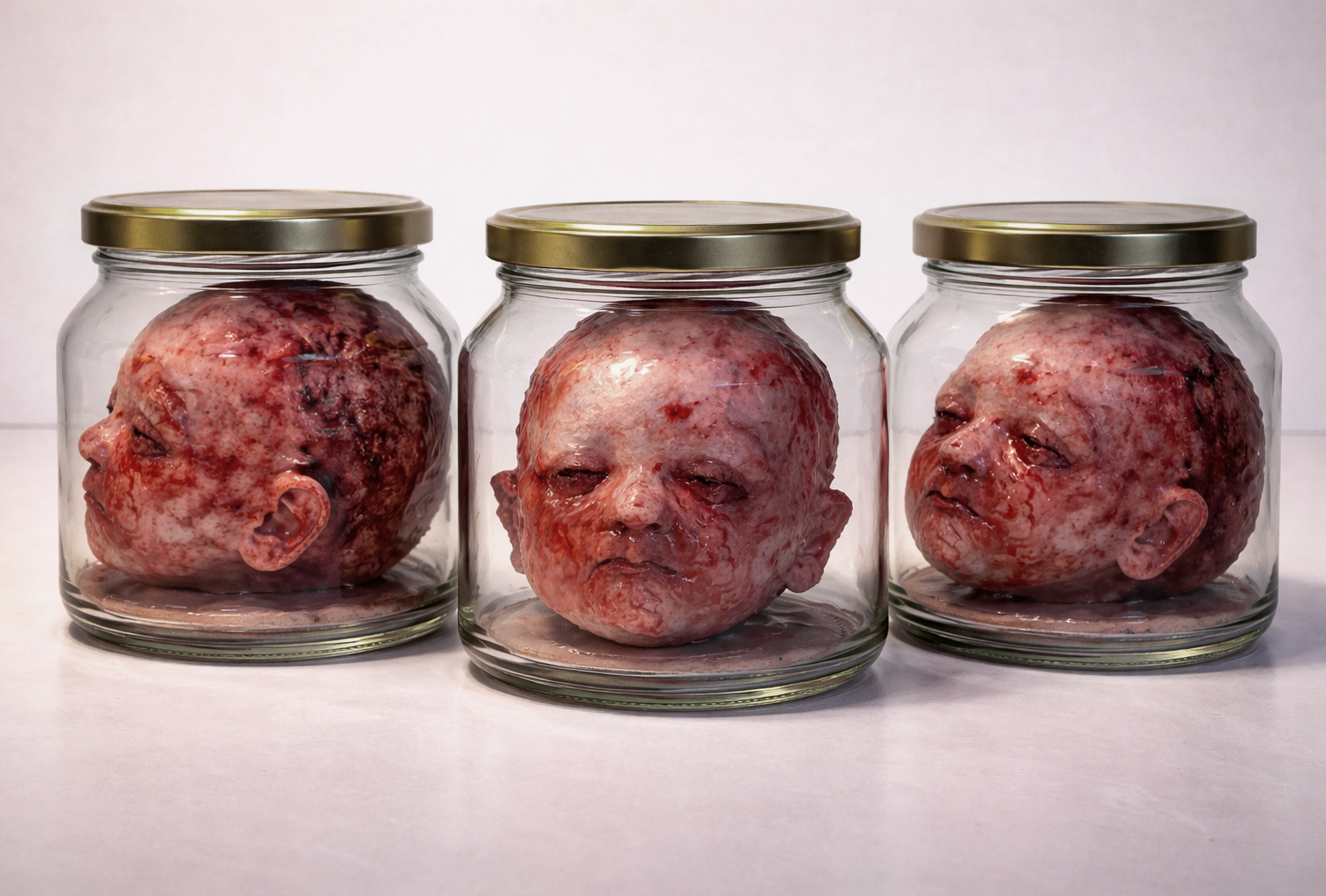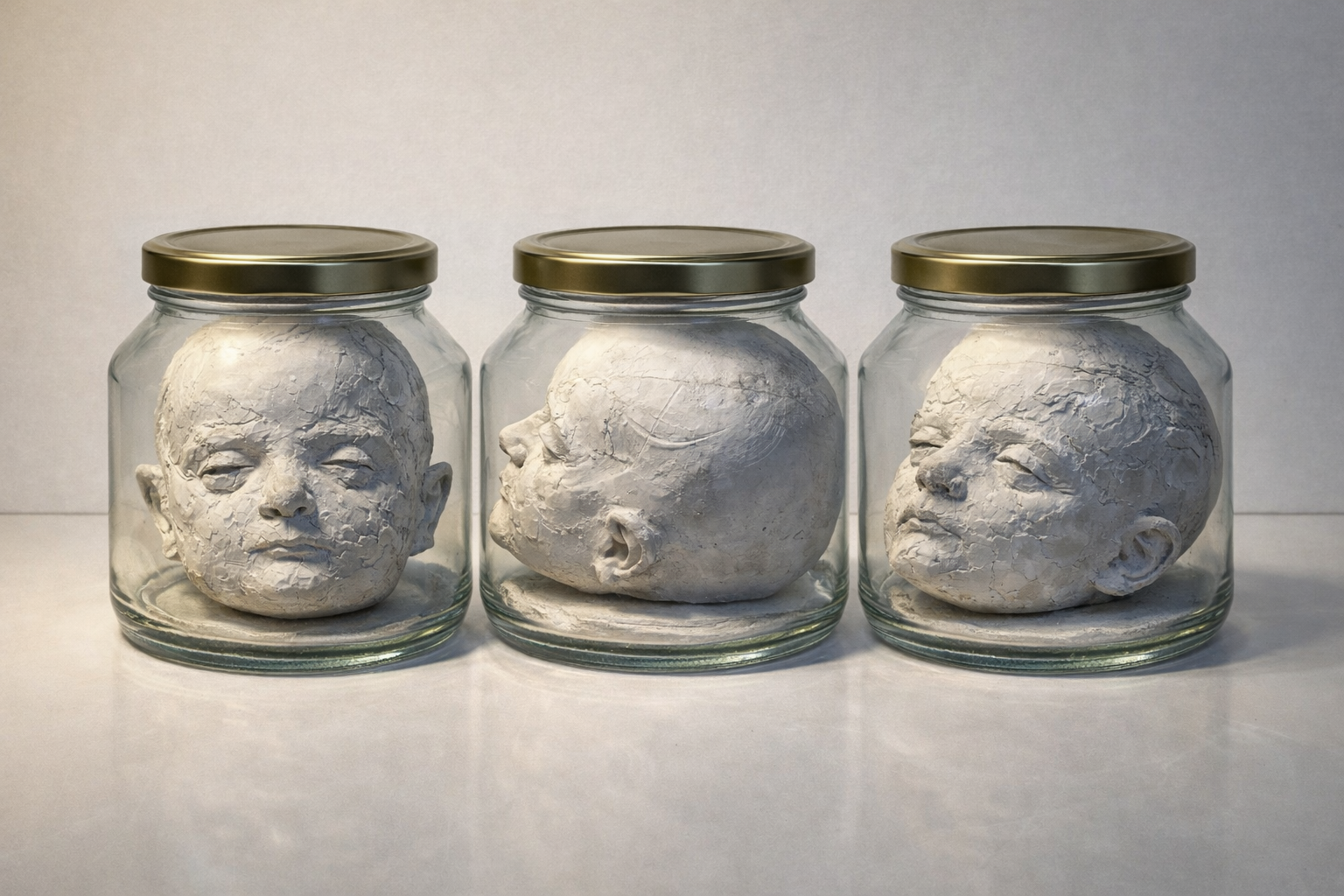 This body of work presents a series of newborn portraits sealed within domestic glass jars—contained, suspended, and removed from any living context. The use of common preservation jars—objects associated with care, nourishment, and everyday domestic routines—introduces a dissonance. These vessels are designed to extend life, to protect and sustain; here, they hold something that cannot be preserved, and should not be contained.