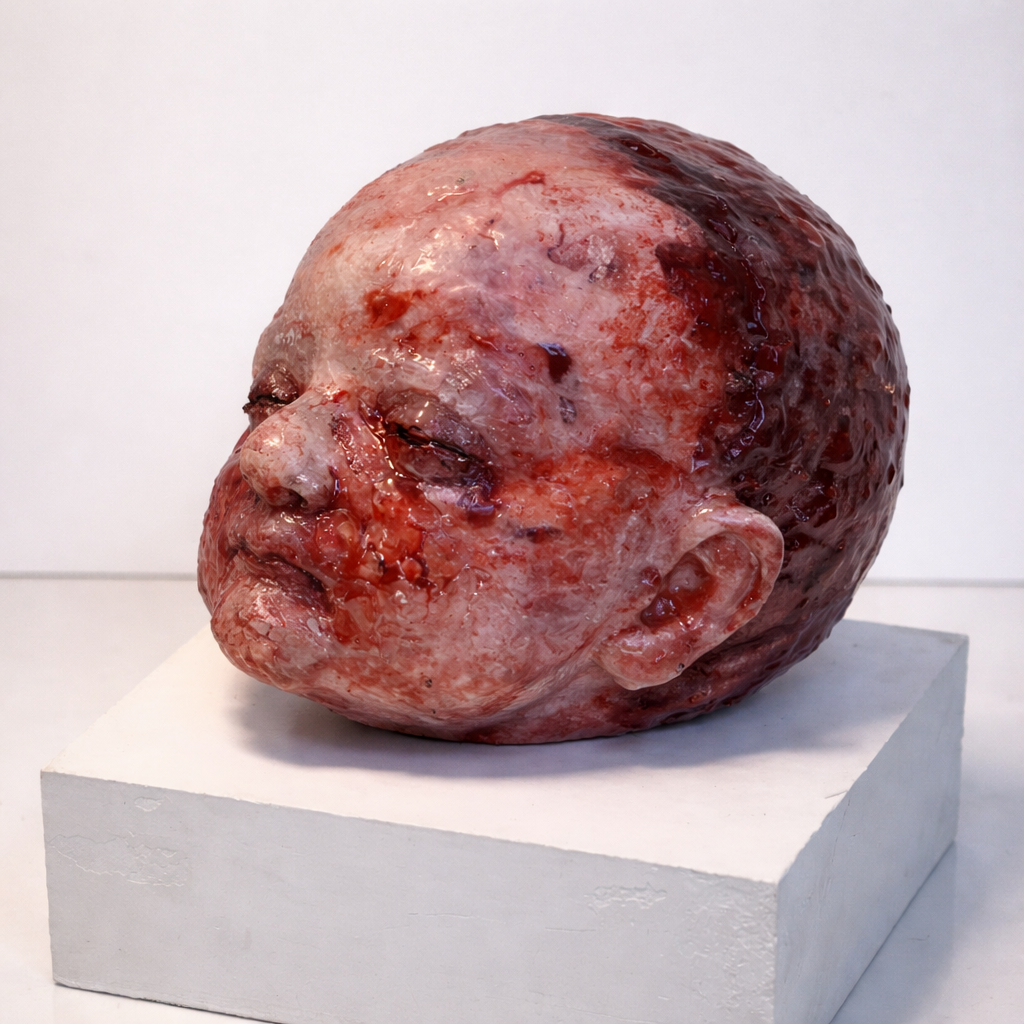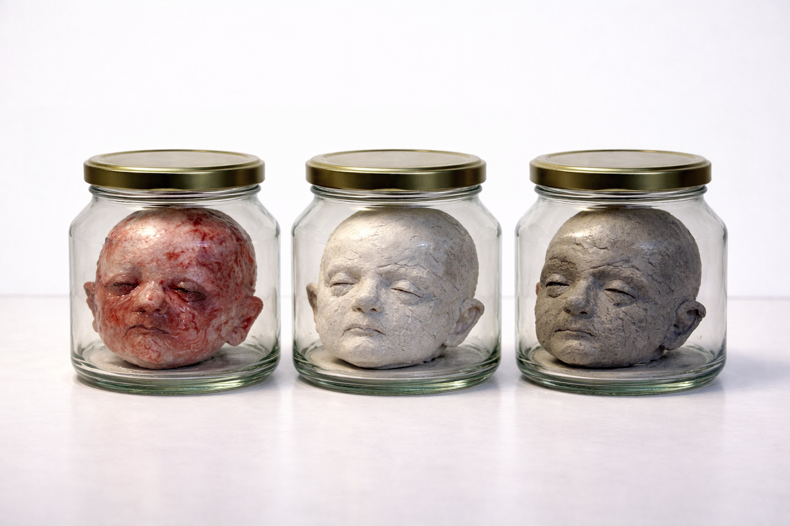 At the core of the work is a material transformation. The portraits shift from flesh-like surfaces toward plaster and concrete, tracing a movement from softness to rigidity, from vulnerability to permanence. What begins as something bodily and alive gradually hardens, losing its elasticity, its responsiveness, its capacity to change. This transition reflects a condition in which life is not only interrupted, but structurally altered—fixed into a state that can no longer evolve.