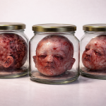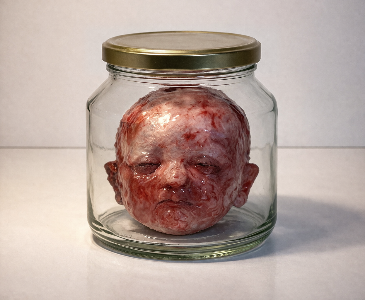The use of the newborn form is not symbolic of innocence, but of beginning—a beginning that, within the conditions of war, is immediately interrupted. The body appears before it has entered life, already subjected to containment, already transformed into an object.