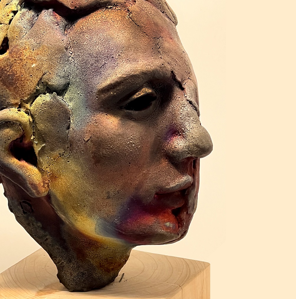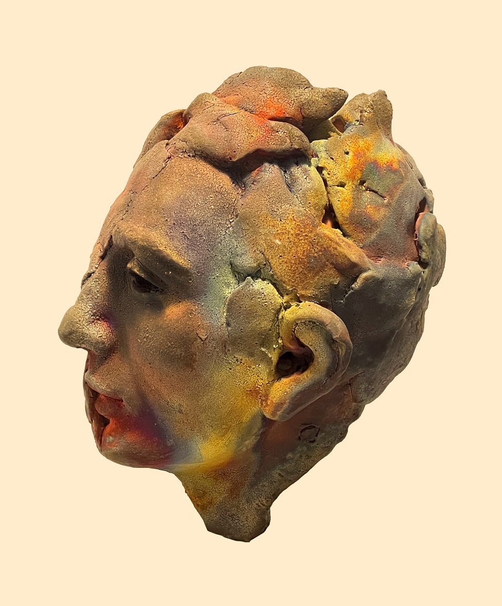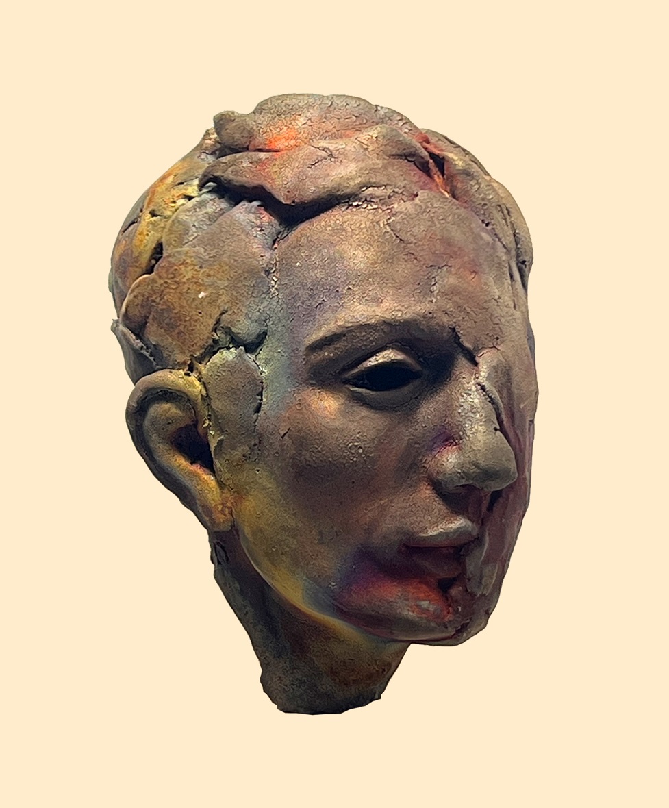 The face remains partially coherent, yet destabilized—its features interrupted by areas of discoloration and compression. What persists is not damage as an event, but as a condition embedded within the material itself.