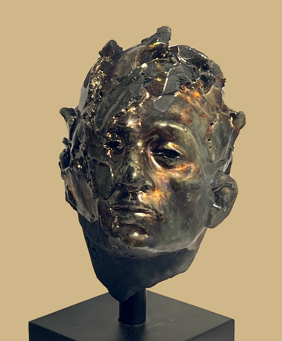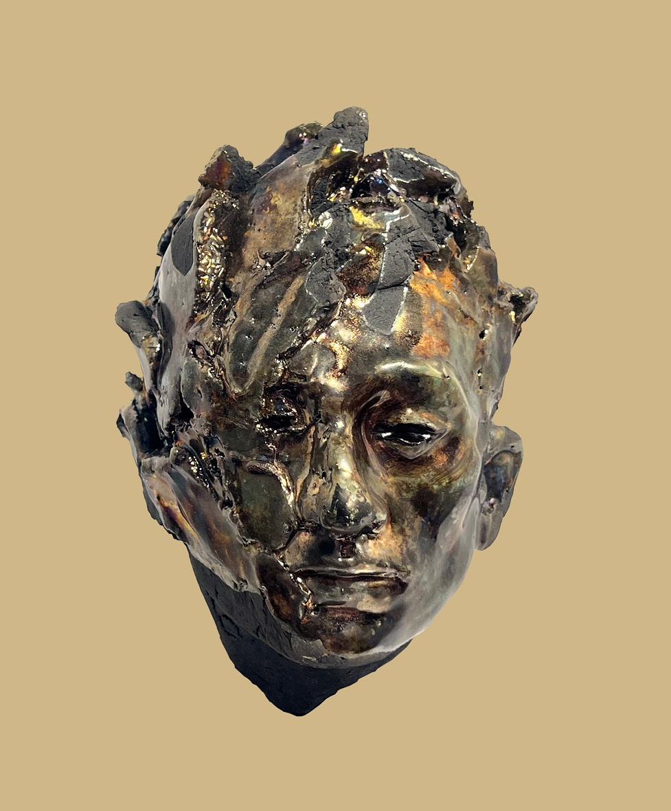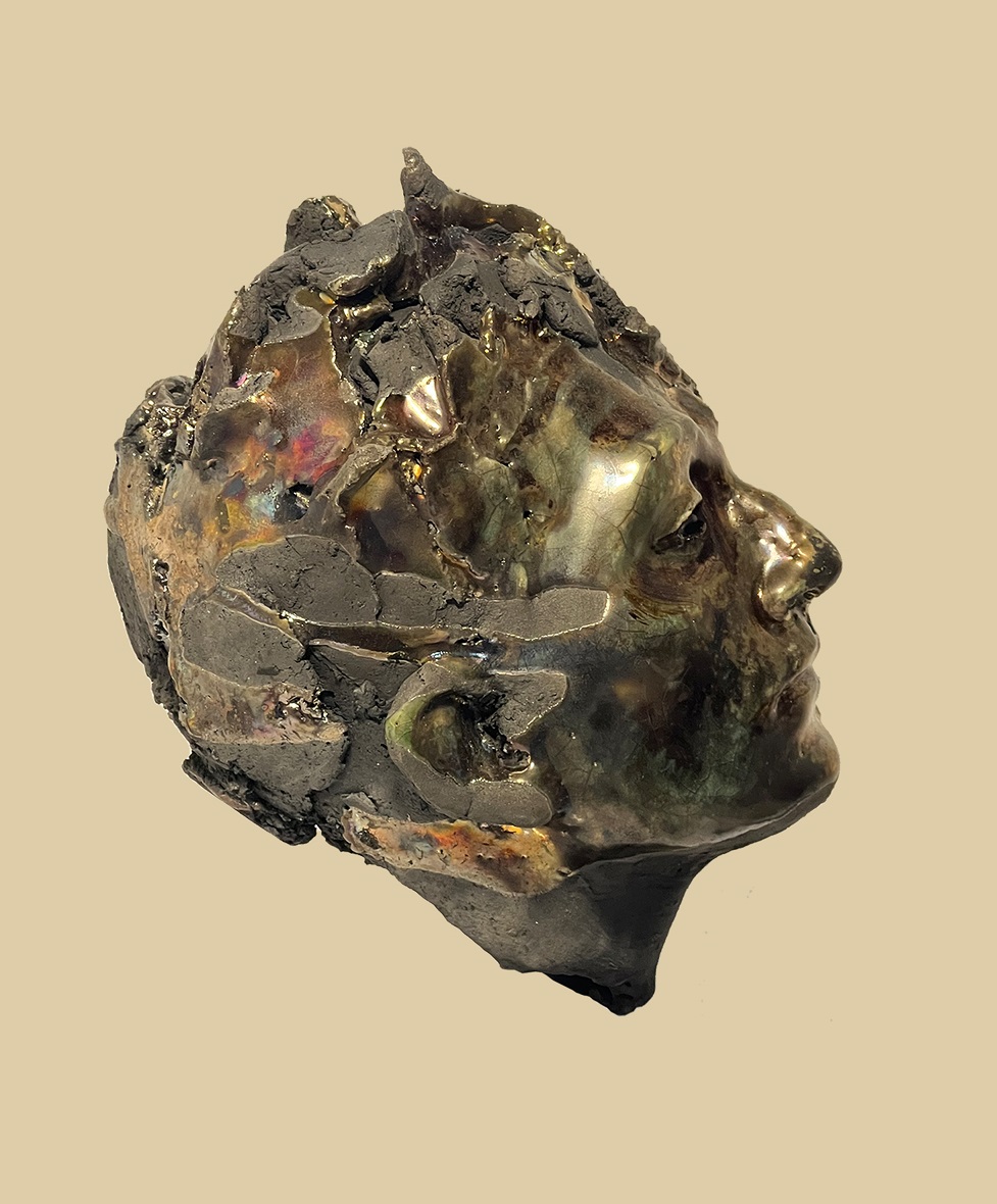 The luster glaze produces a reflective, unstable surface that both reveals and obscures the features, interrupting any fixed reading of the face. Areas appear scorched, fractured, or partially dissolved, as if the material itself has undergone a process of internal rupture.