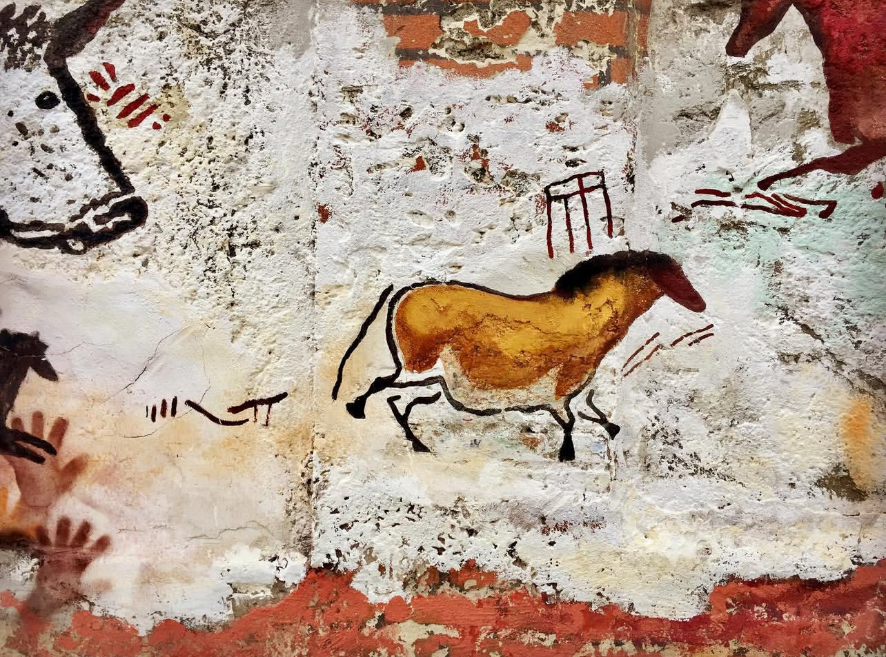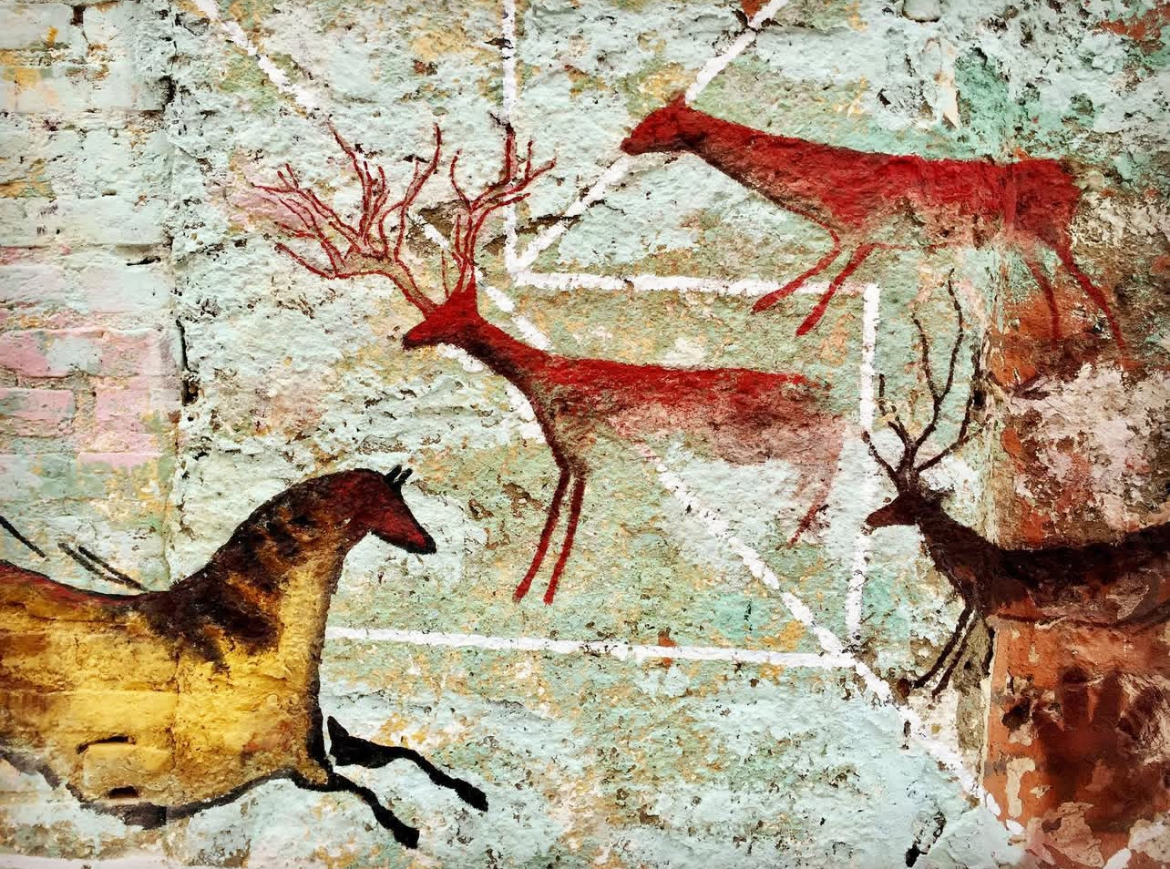 The deterioration of the wall—its exposed bricks, faded pigments, and uneven layers—resonates with the material conditions of prehistoric cave surfaces. This correspondence enables the imagery to emerge as if uncovered rather than applied, positioning the intervention between revelation and construction.