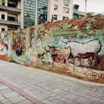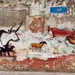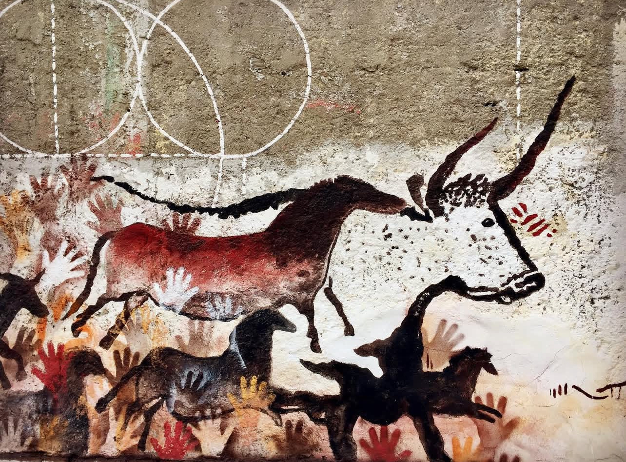 A site-specific intervention engaging with prehistoric visual memory, referencing the imagery of Lascaux cave paintings within a deteriorated urban surface.