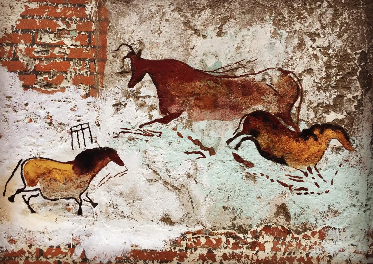 The work draws from early human representations of animals and movement, translating them into a contemporary urban environment. Rather than reconstructing these images as isolated references, they are embedded directly within the eroded texture of the wall, allowing the surface itself to function as a parallel to the cave interior.
