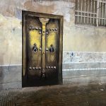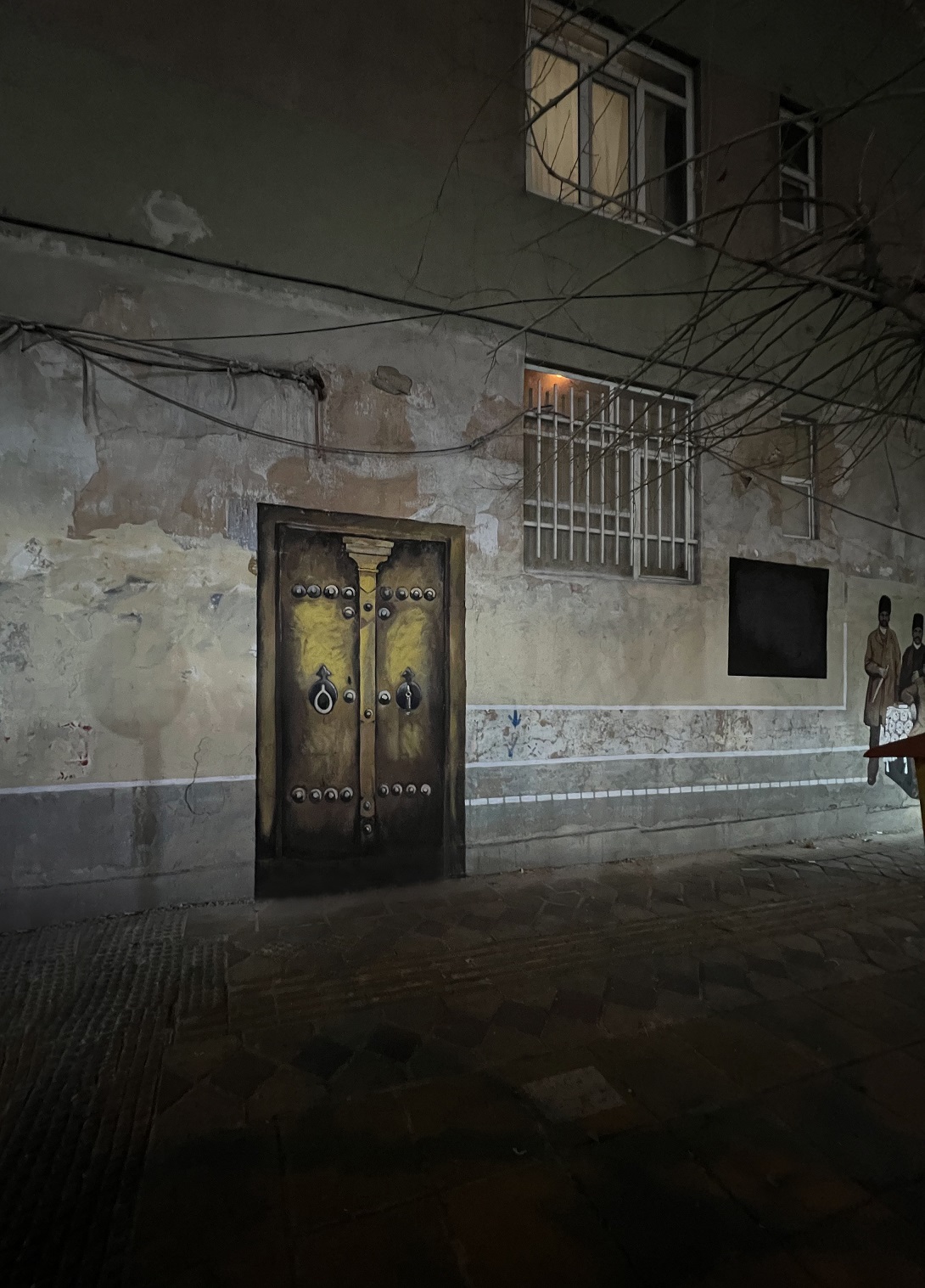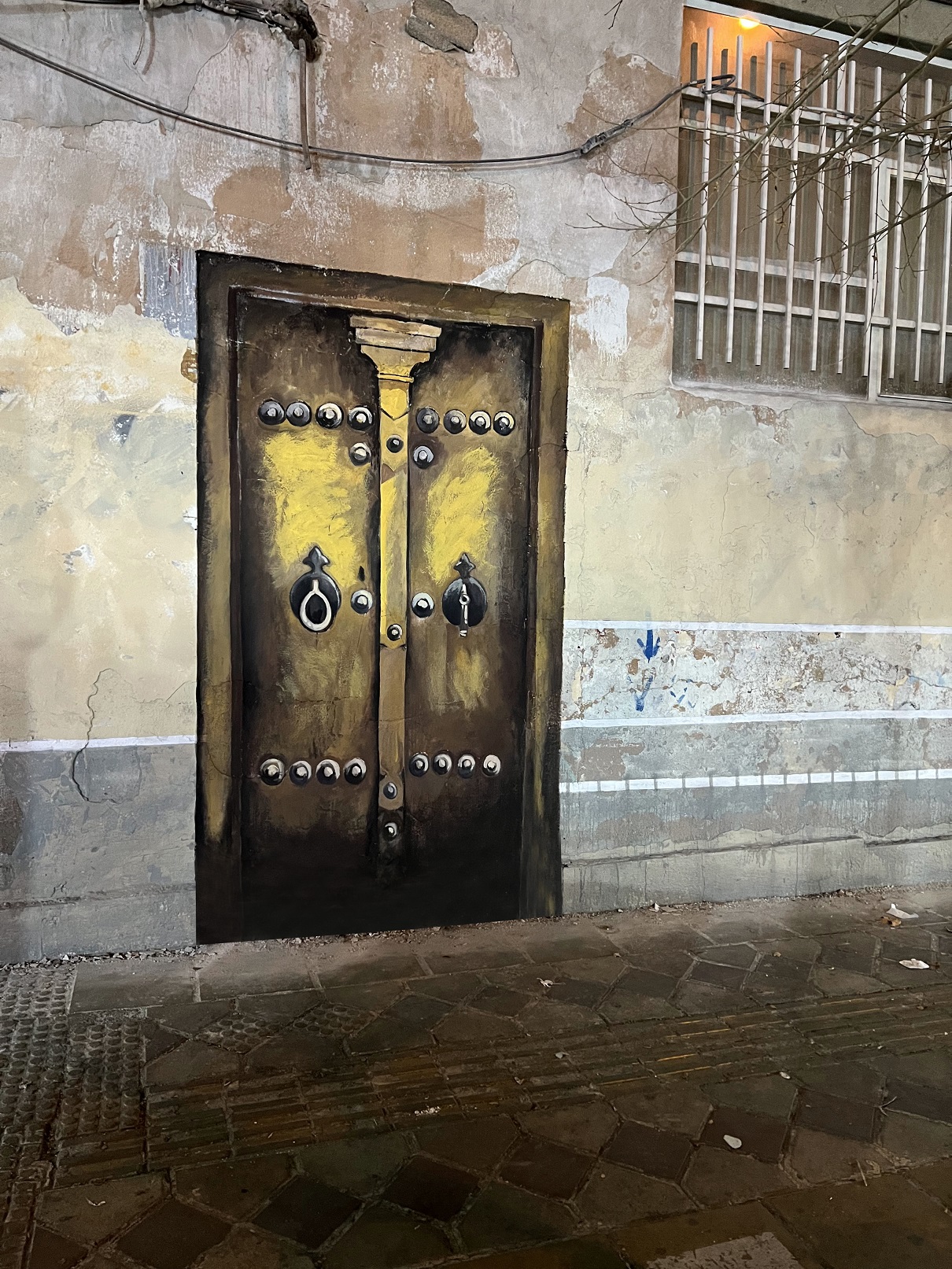 The intervention extends beyond figuration. A painted architectural element—a door—is integrated into the surface, deliberately positioned to blur the boundary between illusion and reality. From a distance, the door is often perceived as functional, reinforcing the work’s engagement with spatial perception.